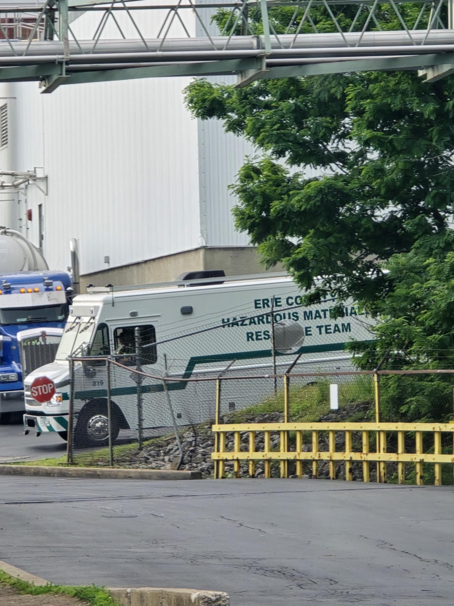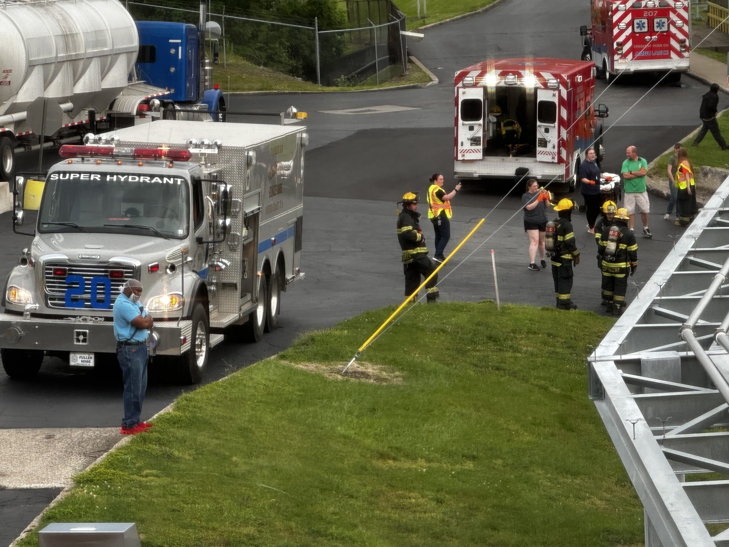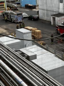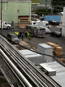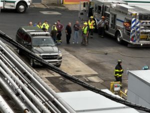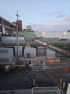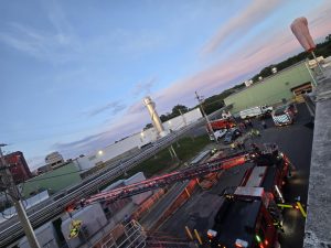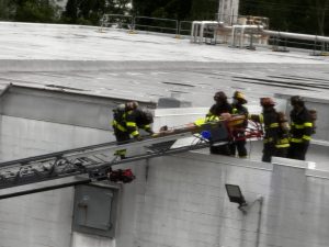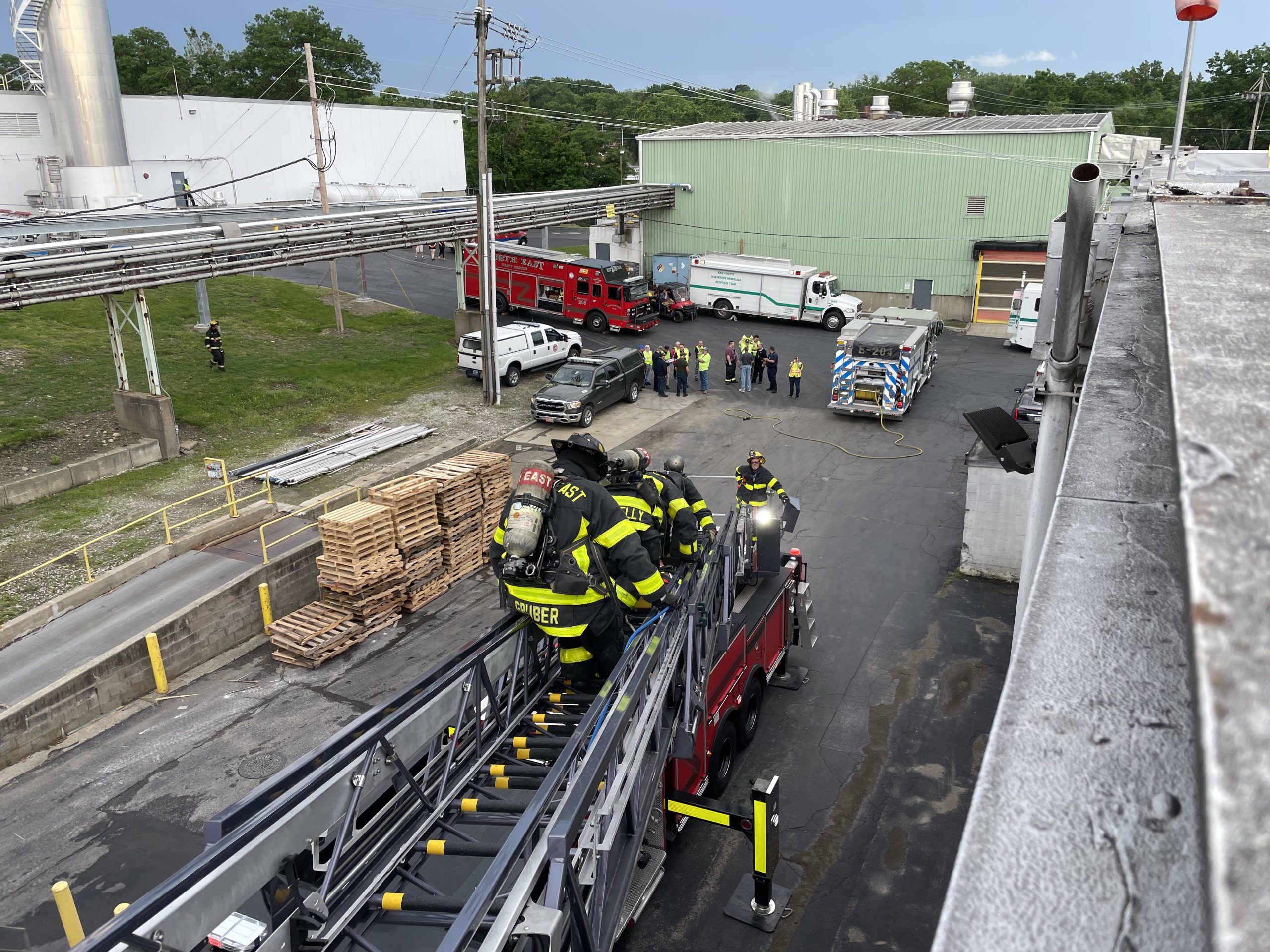 The scenario simulated an ammonia leak with a report of a patient down on the roof of the facility. Chief 200 (DiOrazio) arrived on scene and completed a size-up based on initial reports from Welch’s staff. Ladder 209 was first to arrive and quickly deployed its aerial ladder. Upon making the roof, the crew located the patient and confirmed the presence of an active ammonia leak—promptly requesting additional resources.