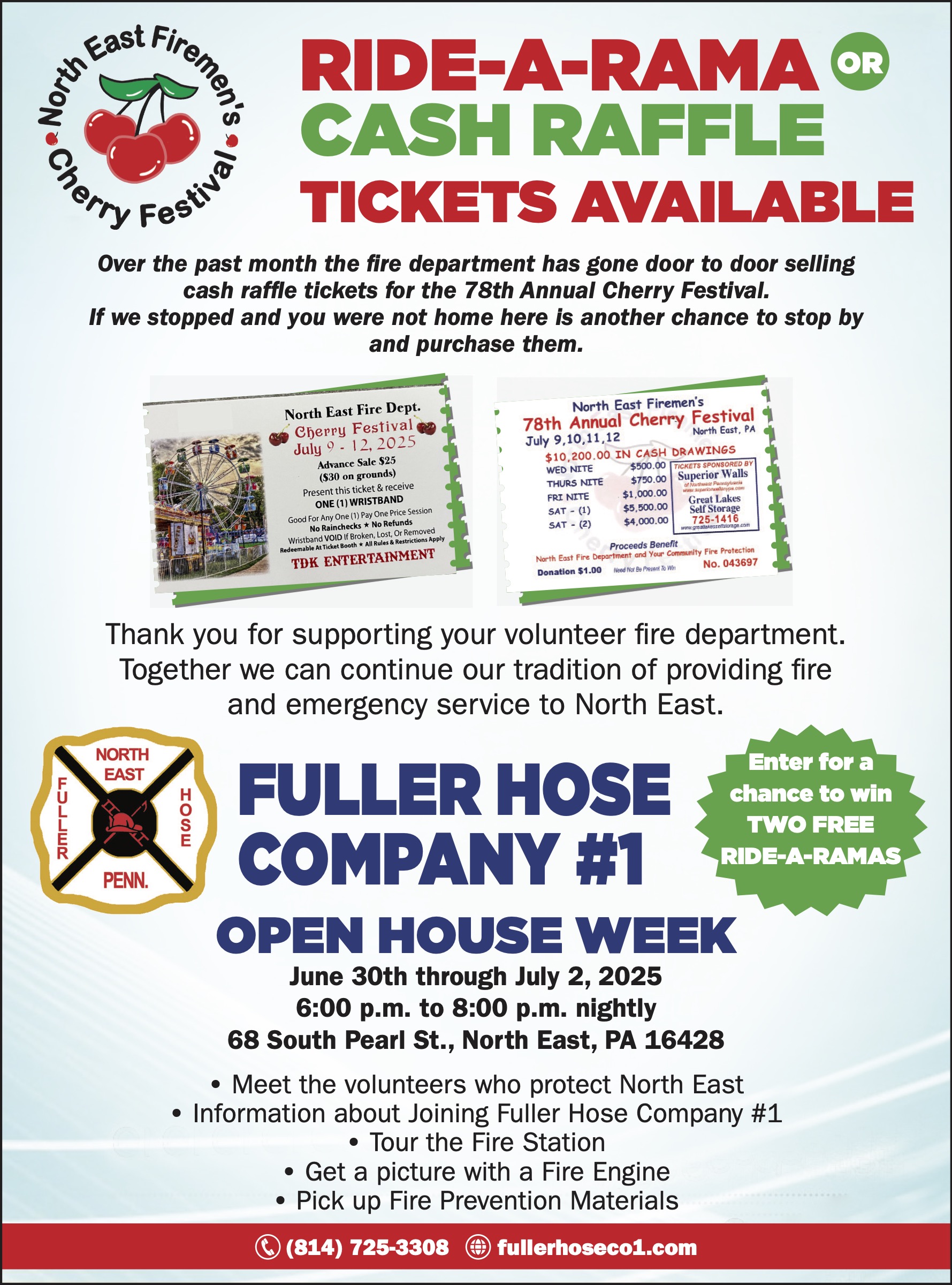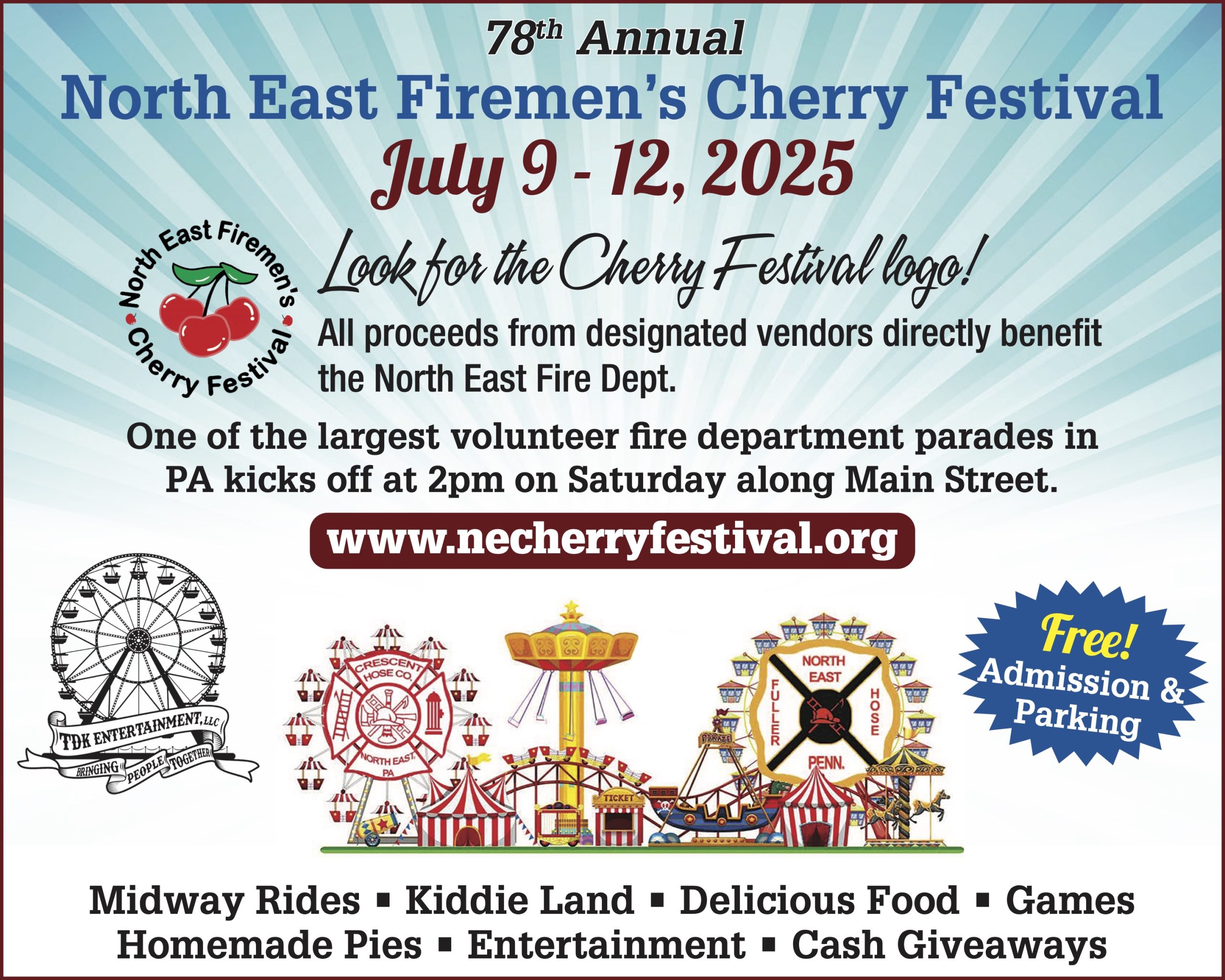 The North East Firemen’s Cherry Festival is the largest fundraiser of the year for both Fuller Hose Co. #1 and Crescent Hose Co. #2. All proceeds help cover essential costs like insurance and equipment to ensure we can continue providing fire, rescue, and EMS services to North East Borough and Township.